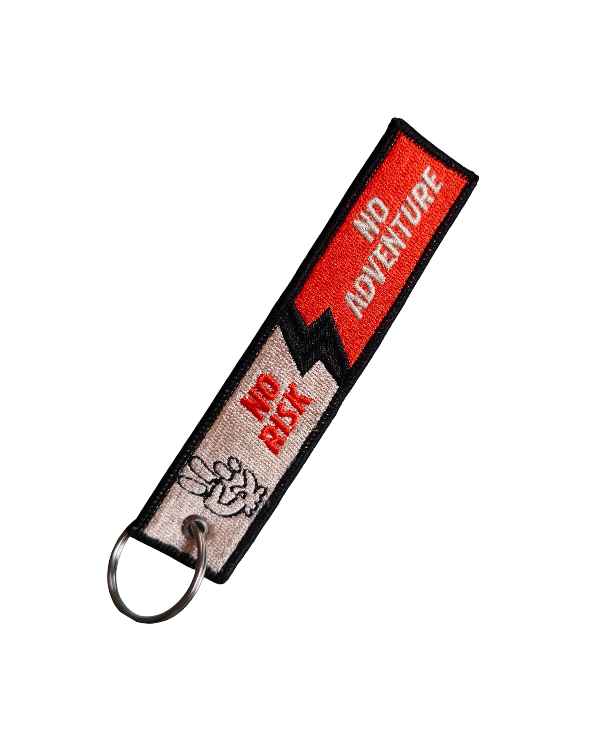 Rectangular fabric key ring with our name and logo embroidered on the front and 'No risk, no adventure' on the back.